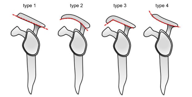 例えば、肩峰(Acromion)の形状が写真4のようなType III:フック型になっていると、他の形状よりもインピンジメントを引き起こす確率が高くなると言われています。