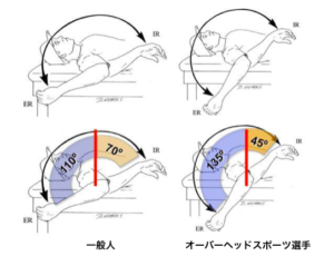 この理由として、野球・テニス・水泳などの肩をよく使う選手は、 体がスポーツ動作に適応することで肩関節の外旋可動域が広がり、その分内旋可動域が狭くなるということがわかっています。