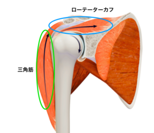 この理由として、肩の大きな筋肉である三角筋のベクトルが上方向にあるため、上腕骨頭自体が三角筋のベクトル方向にシフトしていくからです。しかしローテーターカフがあるおかげにより、この上腕骨頭の上方向のシフトが最小限に抑えらているのです。